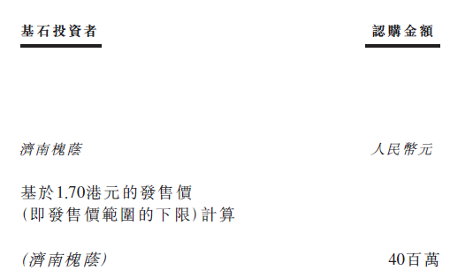 润华服务是次IPO引入1名基石投资者,济南市槐荫区发改委通过济南槐荫城建投资集团认购人民币4000万元的发售股份。