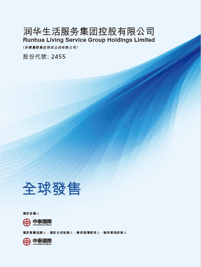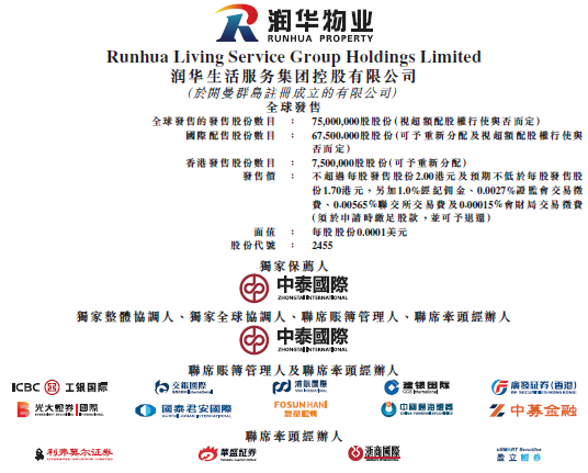 润华服务是次IPO,中泰国际为其独家保荐人,其他包销商包括工银国际、交银国际、浦银国际、建银国际、广发证券、光大证券国际、国泰君安、复星恒利、中国通海证券、中募金融、利弗莫尔证券、华盛资本、浙商国际、盈立证券。