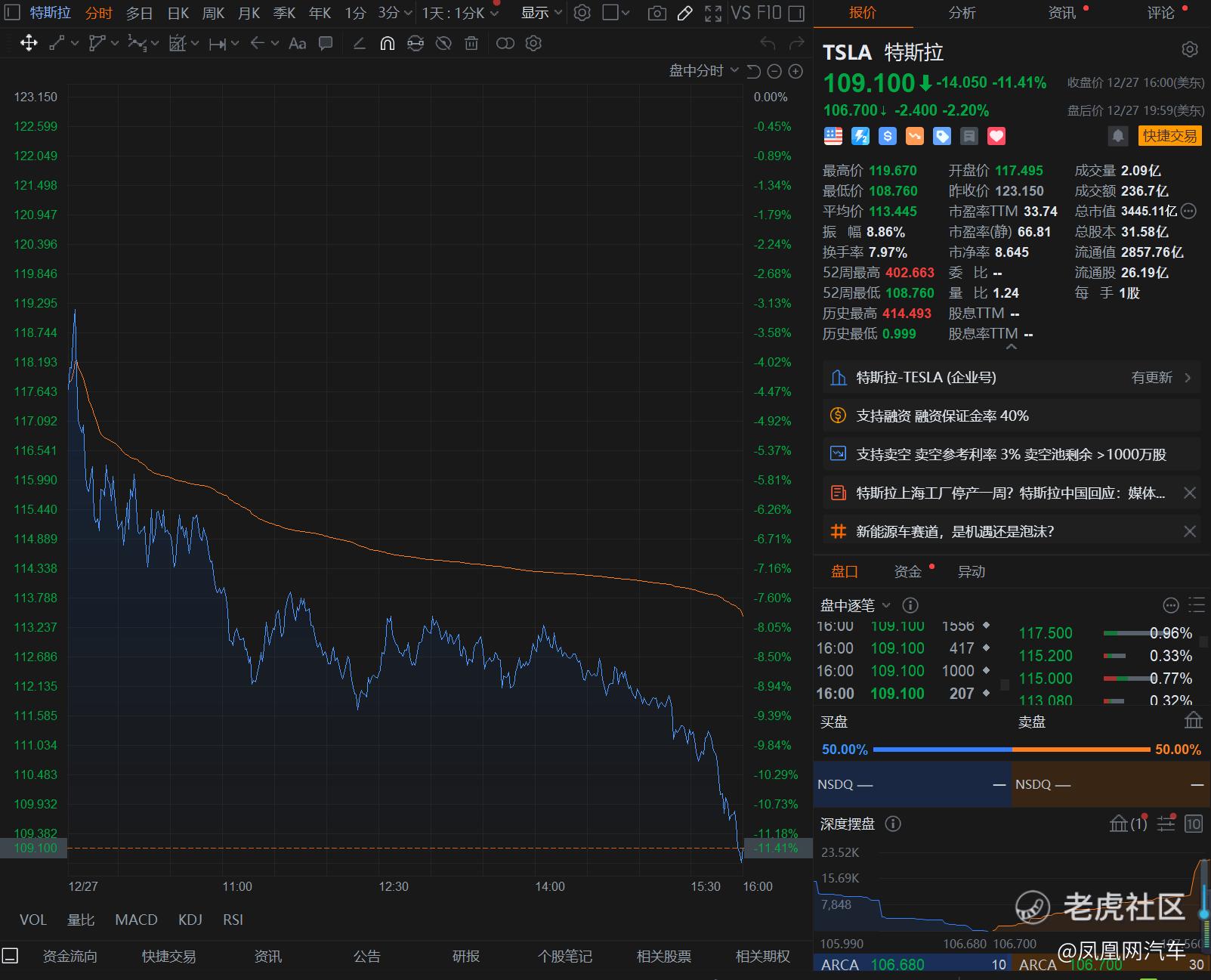 截至美东时间 12月 27日收盘报 109.1美元,特斯拉股价跌幅 11.41%,最新市值 3445.1亿美元。此时特斯拉已连跌 7日,年内已累计下跌近70%,市值也从1.3万亿美元的历史高点跌到只剩零头。