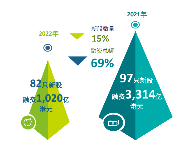 由于俄乌冲突,美联储鹰派加息,内地受疫情影响等因素,2022的港股IPO市场数据与去年相差甚远。根据德勤统计,截止今年12月底,共有82家公司在香港上市,同比下降15%,融资总额1020亿港元,同比下降69%,位列全球第四。其中两只超大型新股:中国中免与天齐锂业,分别融资184亿港元与135亿港元,占融资总额的31%。