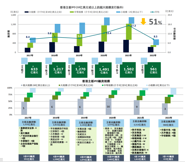 普华永道预计2023年将有约100家公司在香港发行新股上市;当中大型IPO项目料有4至6个,平均集资额约100亿港元。新股集资额将回升至1800至2000亿港元,香港有望重返全球IPO三甲。