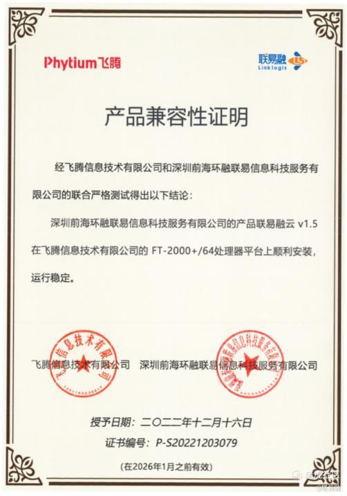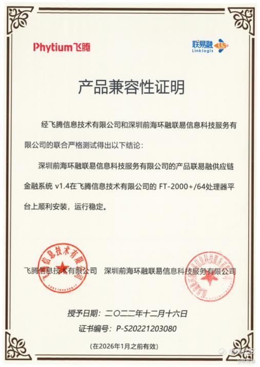 近期,联易融云平台、供应链金融系统和飞腾信息技术有限公司完成产品兼容适配认证。测试报告显示,经过飞腾信息技术有限公司和联易融的联合严格测试,联易融云v1.5、联易融供应链金融系统v1.4在飞腾信息技术有限公司的FT-2000+/64处理器平台上顺利安装,运行稳定。