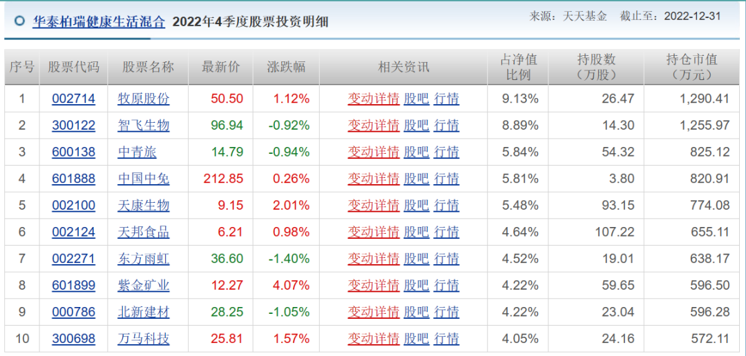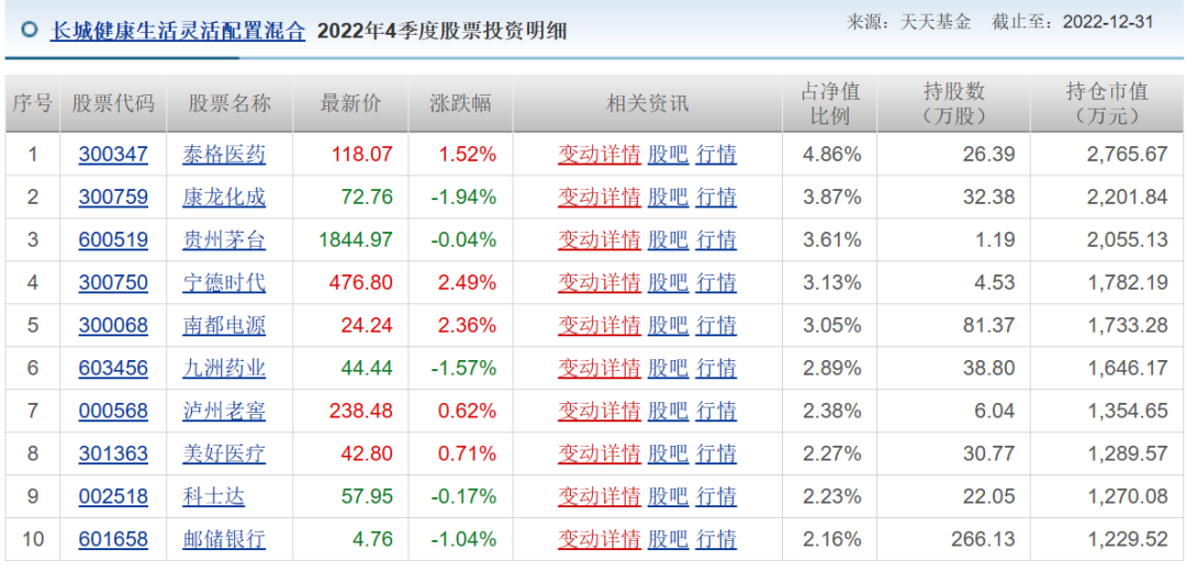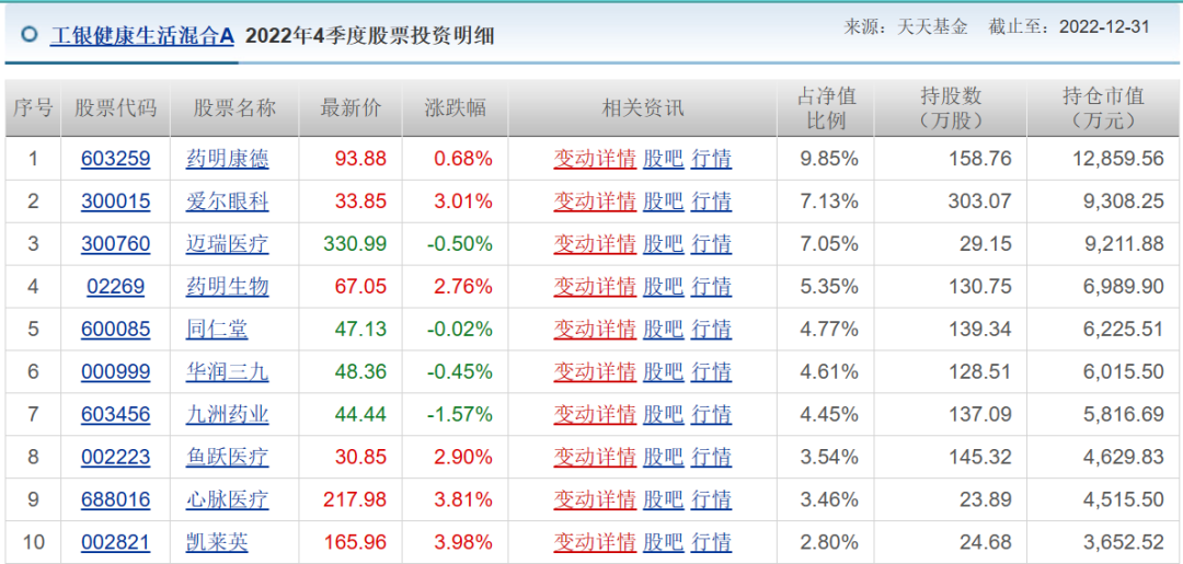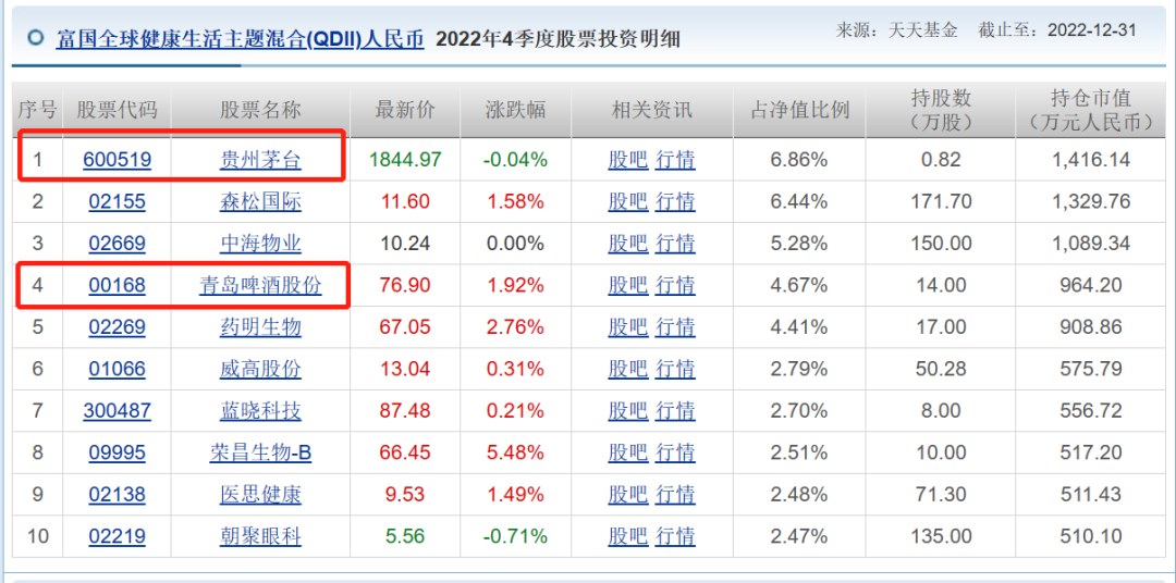 结果,你猜咋着,这个健康生活基金四季报第一大重仓是贵州茅台,然后前十大重仓股里面还有青岛啤酒股份(港股),当然还有不少医药股。