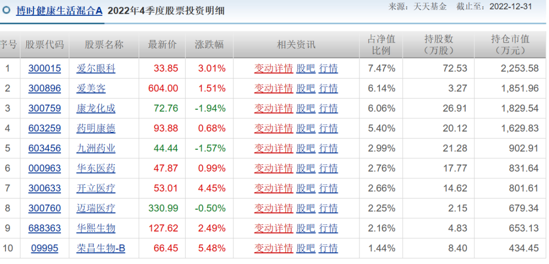 又比如这是博时的健康生活基金,也是全部是医药健康相关的股票。