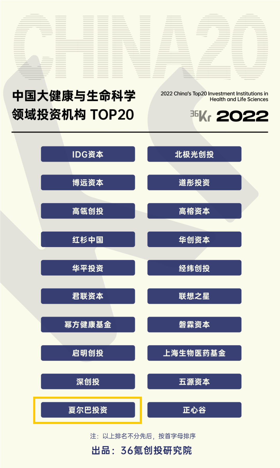 夏尔巴投资凭借在医疗健康领域专业的投资能力和优秀的投资业绩,荣获36氪2022年度“中国大健康与生命科学领域投资机构TOP20”;夏尔巴投资管理合伙人欧阳翔宇先生荣膺36氪2022年度“中国大健康与生命科学领域投资人TOP20”。