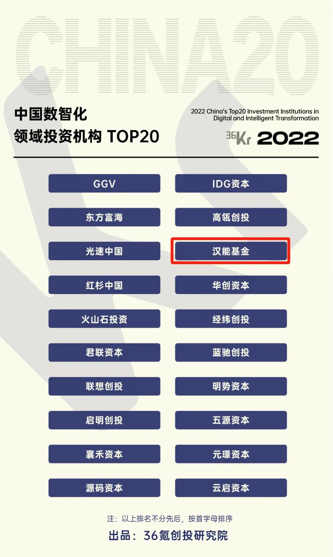 12月14日,36氪“创新经济十大领域投资机构/投资人”正式发布,汉能基金荣获“2022年中国数智化领域投资机构TOP20”。