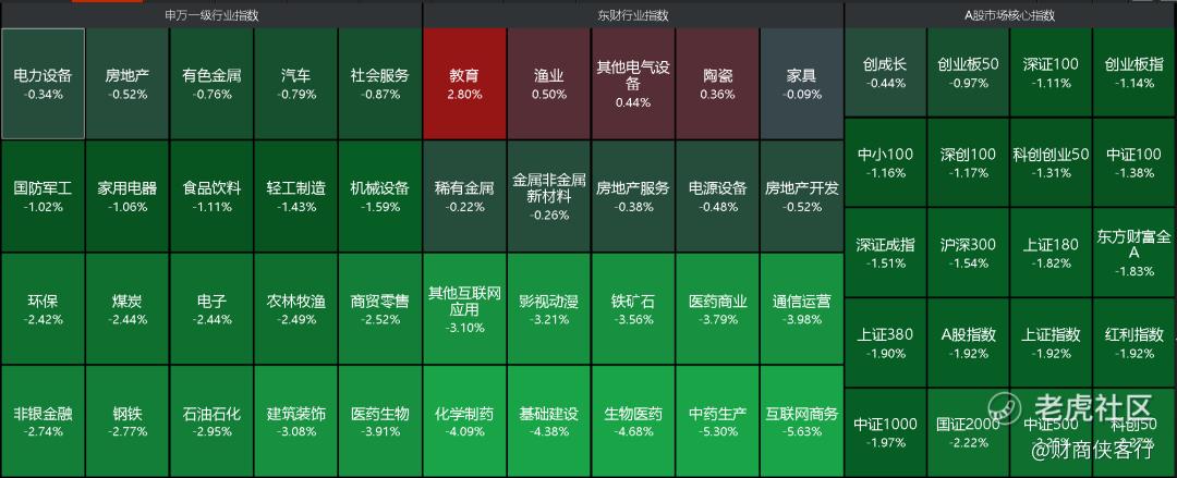 申万31个行业全部收绿,这大概是想告诉我们春天快来了吧。其中医药生物、建筑装饰、石油石化、钢铁、非银金融、商品零售、农林牧渔、煤炭、电子、环保等跌幅居前。电力设备、房地产、有色金属、汽车等板块一度冲高,试图强行带动市场,无耐市场人气不佳,最终缴械投降。