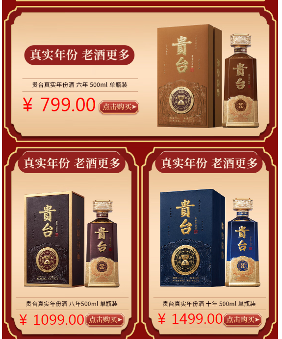 去年9月,贵台酒业推出真实年份酒战略,打造贵台真年份六年、八年、十年三款产品,推广主题为“真实年份”和“老酒更多”。价格方面,贵台酒定位中高端产品,年份酒六年指导价为899元、八年为1099元、十年为1499元,几乎参考了茅台定价。贵台京东自营旗舰店显示,除了年份酒六年为799元,比指导价便宜100元,八年、十年的售价均和指导价一致。