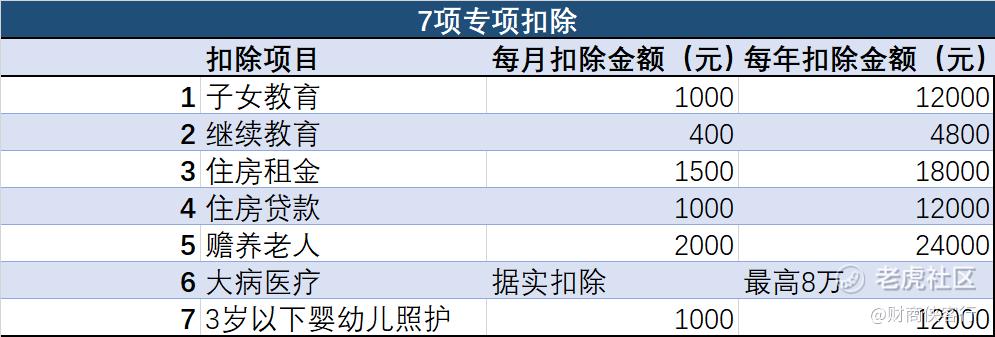 其中,免征额是6万,五险一金假设按照一年1.2万计算,专项附加扣除见下表,