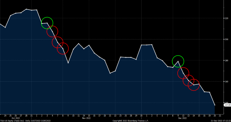 马斯克11月初卖了3天股票,12月中又卖了3天股票,我把这6天在图上用红圈标注出来,用绿圈标注了卖股票前一天的股价。