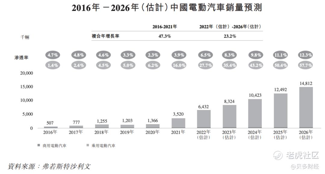 据弗若斯特沙利文数据显示,2021年中国是全世界电动汽车销量最高的国家,共为352万辆电动汽车,预期将于2026年达到1481.2万辆,2022年至2026年将按复合年增长率23.2%增长,乘用电动汽车及商用电动汽车的渗透率分别为57.7%及12.3%。