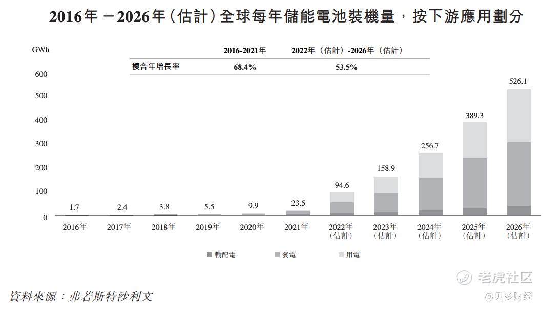 此外,瑞浦兰钧的储能电池产品用于全球(包括中国及如美国、欧洲、日本、澳大利亚、印度、东南亚及非洲等海外市场)的家用、商业及工业应用。根据弗若斯特沙利文数据显示,全球每年储能电池装机量自2016年的1.7GWh按复合年增长率68.4%增加至2021年的23.5GWh,每年储能电池装机量预期将继续于2022年至2026年按复合年增长率53.5%增长,到2026年达到526.1GWh。