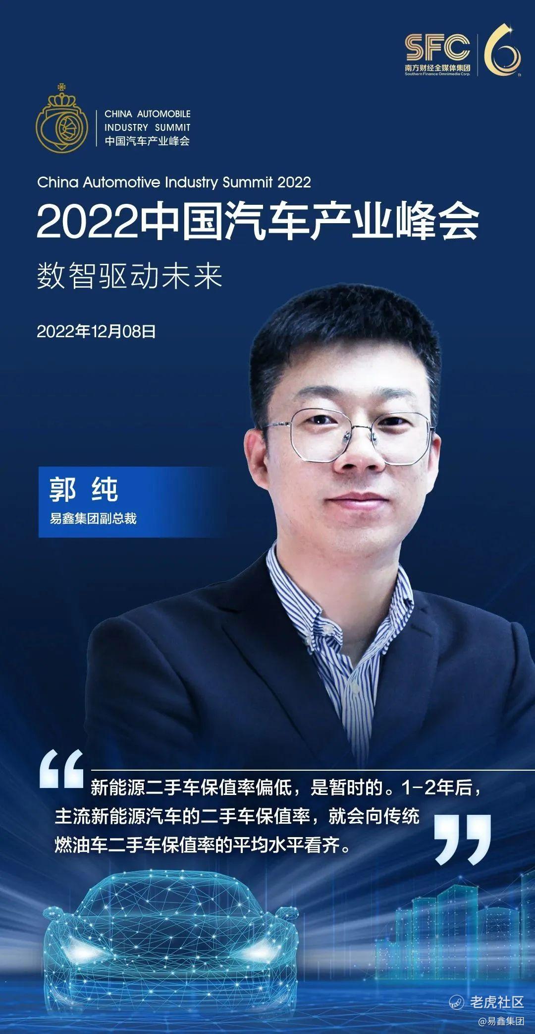 近日,由21世纪经济报道、中国汽车金融主办的“2022中国汽车产业峰会”成功举办。期间,易鑫集团副总裁郭纯在参加主题为“新能源汽车时代的金融引擎”的圆桌讨论时表示,新能源车二手车保值率偏低的状态是暂时的,预计1-2年后,主流新能源汽车的二手车保值率就会向传统燃油车保值率的平均水平看齐。