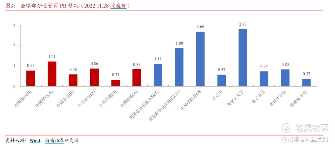 数据显示,截至28日,H股移动、电信、联通PB估值0.77/0.57/0.31倍,明显低于历史五年均值0.99/0.62/0.55倍,更大幅低于全球运营商PB均值1.5倍,A股移动/电信/联通PB 1.21/0.86/0.83倍,相较于全球龙头的估值同样相对较低。