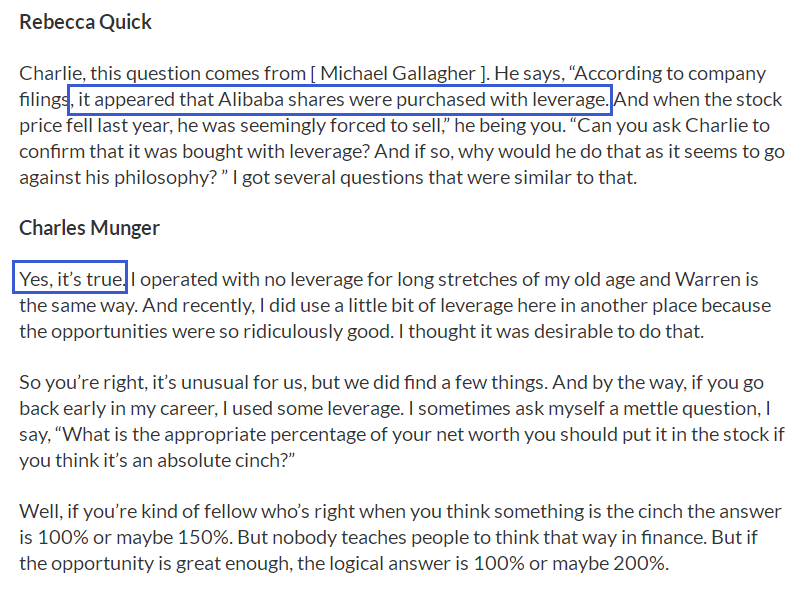 这里面都解释了,他的原话是。是的,你说的是对的(关于动用杠杆买阿里巴巴,后来又被迫卖阿里巴巴)。而且他还解释了,他并不是不用杠杆。他最近确实动用了一些杠杆买入一些看起来很好机会的公司(because the opportunities were so ridiculously good)。