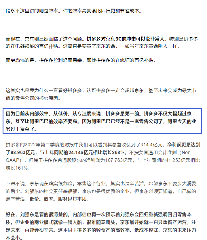 因为在效率,拼多多是第一位的。再叠加效率复利的影响,拼多多的未来会很恐怖。