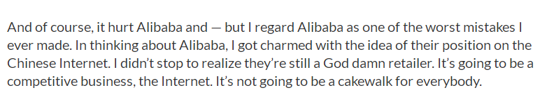 “我认为阿里巴巴是我犯过最大的错误之一。在考虑阿里巴巴的时候,我被它在中国internet市场上的占有率而着迷,我并没有意识到,阿里巴巴的本质仍旧是TMD的零售商,而零售行业是一个竞争激烈的行业,即使是在互联网环境中也不是简单的事情。”