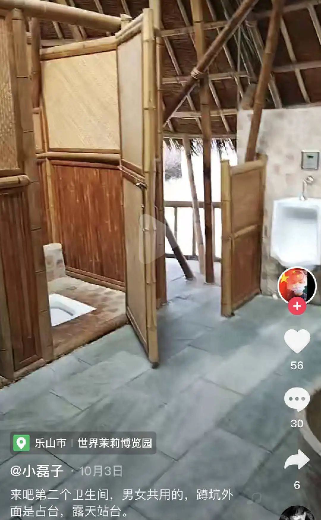 该景区内一座斗笠造型的厕所,内部为男女共用,外部却没有任何建筑外墙类的遮挡。竹子砖石结构的围墙,从外往里看,清清楚楚。从里面往外看,一目了然。