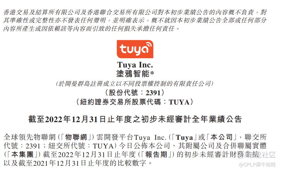 【涂鸦智能2022年净亏损1.46亿美元,同比收窄16.7%】3月2日,涂鸦智能发布年报。2022年,涂鸦智能的总收入为2.08亿美元,同比下降约31.1%,其中PaaS收入为1.53亿美元,同比下降约41.5%;SaaS及其他收入为2980万美元,同比增长约60.6%;整体毛利率43.0%,同比上升0.7个百分点,PaaS的毛利率41.1%,同比下降1.3个百分点;净亏损为1.46亿美元,同比收窄16.7%。(公司公告)