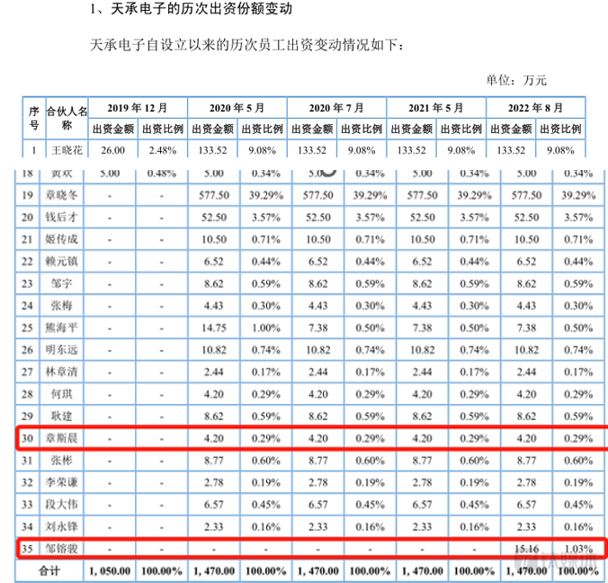 天承科技设立持股平台对员工激励是好事,但其中邹镕骏、章斯晨是如何获得股权激励却令人费解。据悉,邹镕骏、章斯晨分别于2019年10月、2019年7月入职天承科技,而邹镕骏2022年8月入股了天承电子,章斯晨2020年5月入股了天承电子。那么,为何邹镕骏、章斯晨入职天承科技不久,就能获得股权激励?特别是章斯晨,其入职天承科技仅10个月的时间是如何获得股权激励?
