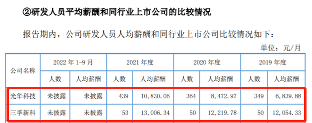 有意思的是,虽然毛利率不如同行,但天承科技研发人员的待遇却远高于同行。公开资料显示,2019年-2021年,天承科技研发人员的人均薪酬分别为18637.34元/月、17876.56元/月、18577.91元/月,而同行可比公司研发人员的薪酬具体如下: