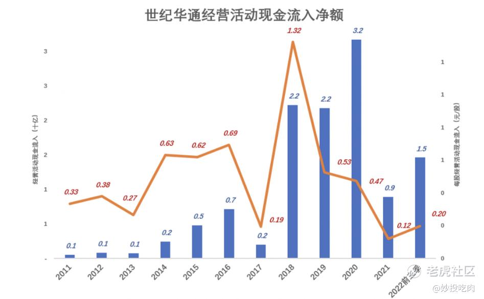 2021年,经营活动现金流摊到每股只有0.12元,较2018年下降91%。