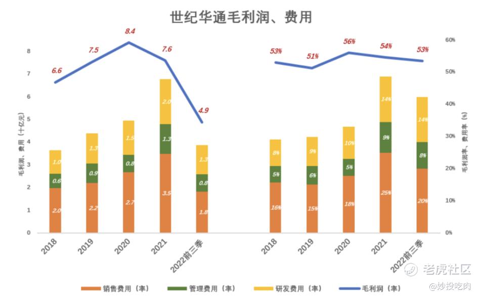 不料2021年就“变脸”,毛利润率降至54%、总费用率升至49%,两者间的差距只剩5个百分点。