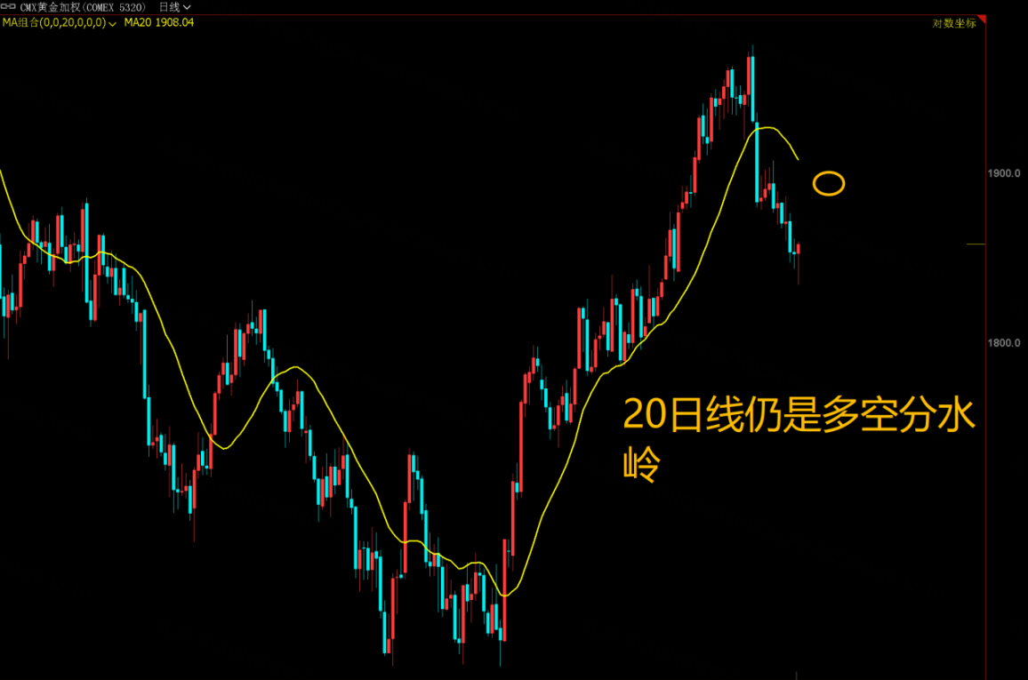 以20日均线作为多空分水岭,对黄金来说仍有效,若再下跌,那么低点将在1780附近,而如果战争升级的消息配合,那么上涨可能就得关注前高了。所以如果近期再快速跌至1780附近,那么黄金就是一个不错的抄底位置,跌不到就看20日均线吧。