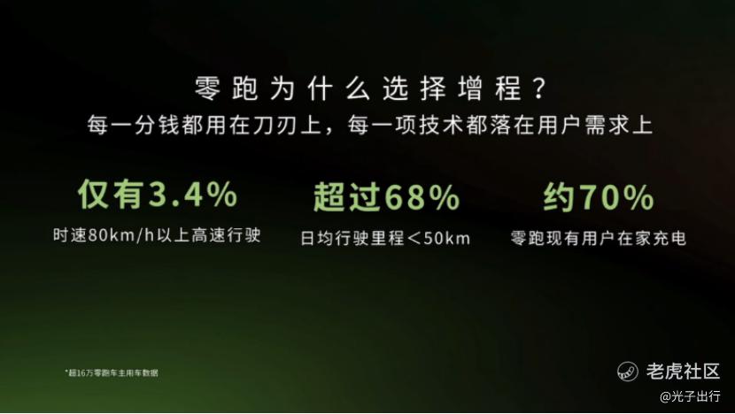朱江明表示,从用户角度出发,目前零跑汽车已交付了16万台纯电车,用户的实际用车数据分析来看,时速超80km/h以上的高速行驶仅为3.4%,为考虑零跑T03车型上高速概率低的客观性,整体在高速上行驶的比重不会超过10%- 15%,所以零跑选择了纯电续航更多的增程模式。
