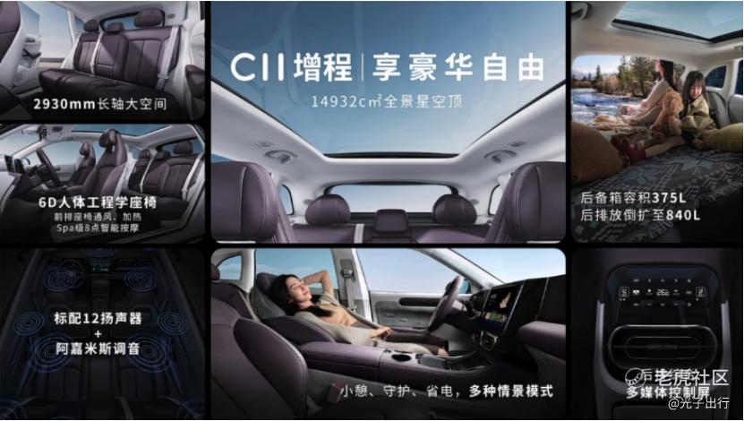 除此之外零跑C11增程版配备了更加高级的新一代海格力斯电驱系统、高通骁龙8155数字座舱、隔绝99. 5%紫外线视野提升8%的全景星空顶、车内人脸识别调整座椅和后视镜等、手机蓝牙无感钥匙、无框车门、阿嘉米斯沉浸式音乐座舱等配置。