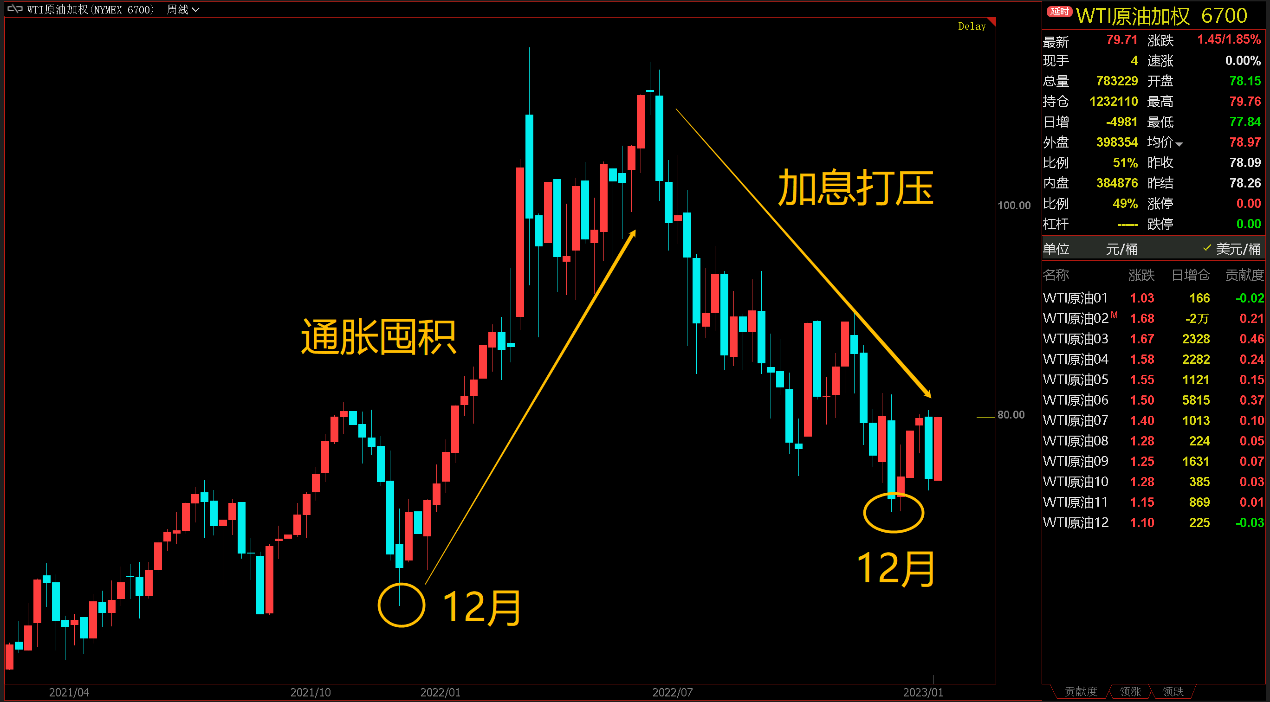 今年原油的技术特点与去年其实十分类似,上半年由于预期美联储放缓加息,大宗商品价格再起,油价上涨,使得CPI下跌幅度不及预期,通胀担忧再起,迫使美联储在某个时点重新鹰派加息的路径,打压原油价格。所以2023年油价上半年看涨,下半年看跌,总体区间震荡,是今年油价的总体预期,但战争的存在(且可能扩散),可能会使价格波动幅度扩大,因此讨论创新高与不创新高的意义是不大的,破100其实并不困难,但就现在咱们知道去年70美元的价格低点很重要就行了,甚至会是今年的低点。