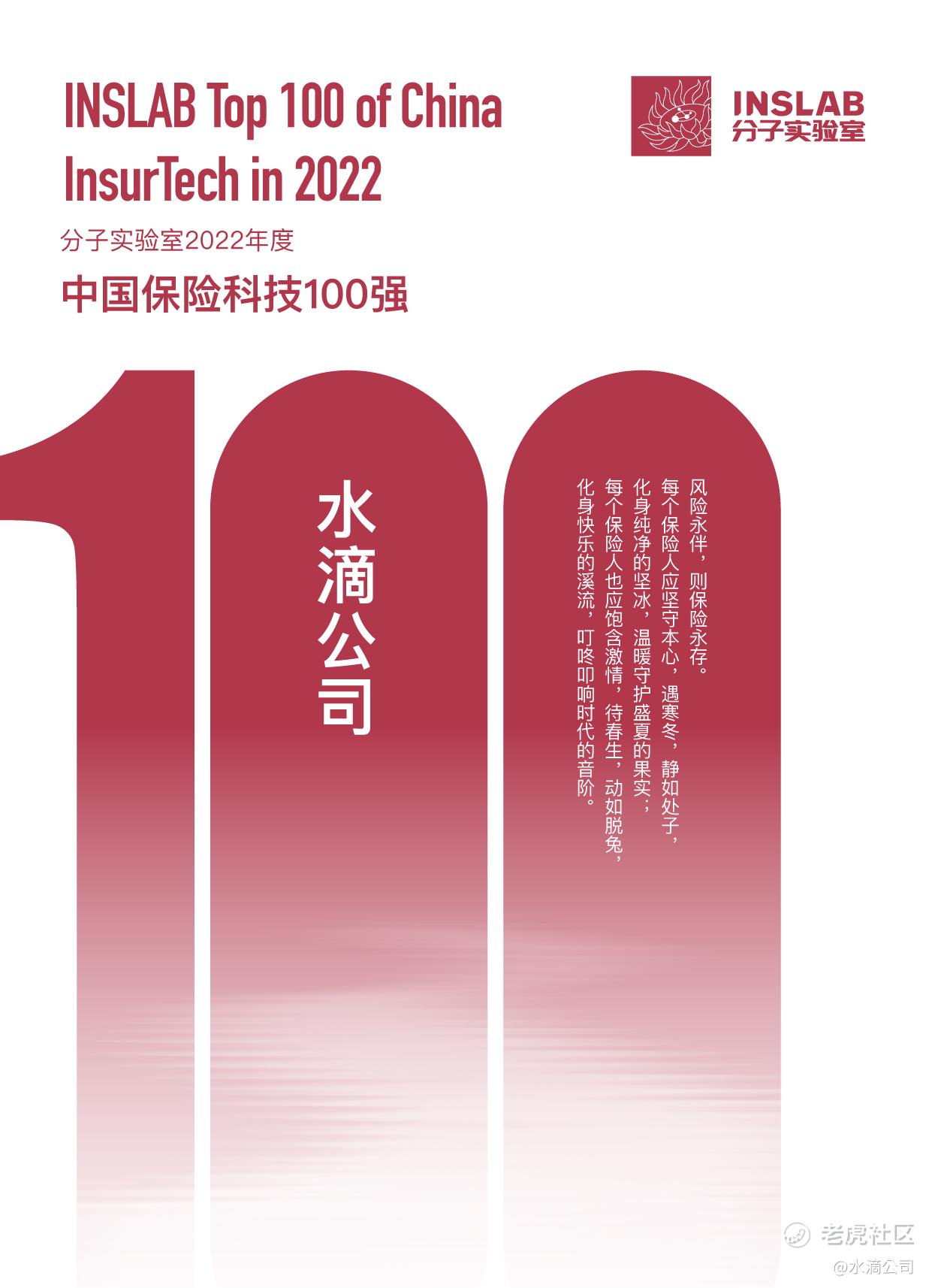 近日,分子实验室公布“2022年度中国保险科技100强”榜单。凭借着在保险科技领域的创新和深耕,$水滴(WDH)$蝉联入选。据悉,该榜单经过2022年保险科技创新大赛、乌镇保险科技节和两百余位评委的提名推荐,其评选结果在行业内具有极强的公信力和影响力。
