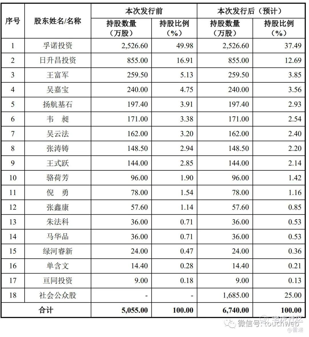 IPO后,孚诺投资持股为37.49%,日升昌投资持股为12.69%,王富军持股为3.85%,吴嘉宝持股为3.56%,扬航基石持股为2.93%,韦昶持股为2.54%,吴云法持股为2.4%,张涛铸持股为2.2%;