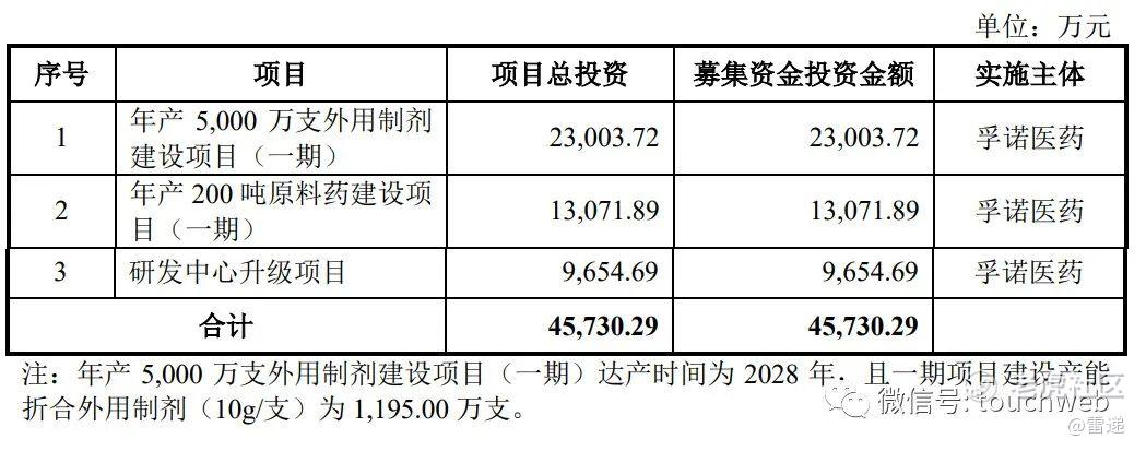 孚诺医药计划募资4.57亿元,其中,2.3亿元用于年产5000万支外用制剂建设项目(一期),1.3亿元用于年产200吨原料药建设项目(一期),9654.69万元用于研发中心升级项目。