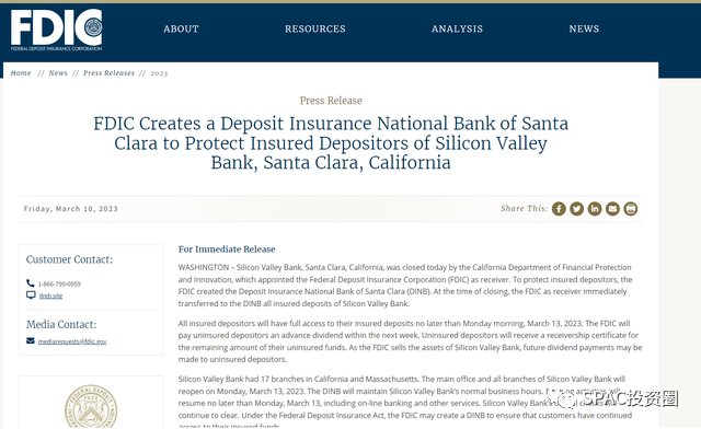 为保护投保的储户,美国联邦存款保险公司创建了存款保险国家银行(DINB),硅谷银行在关闭时,作为接管人的联邦存款保险公司需立即将硅谷银行所有受保存款转移到DINB。