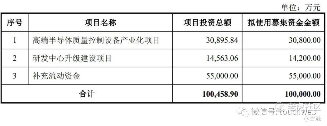 其中,3.08亿元用于高端半导体质量控制设备产业化项目,1.42亿元用于研发中心升级建设项目,5.5亿元用于补充流动资金。