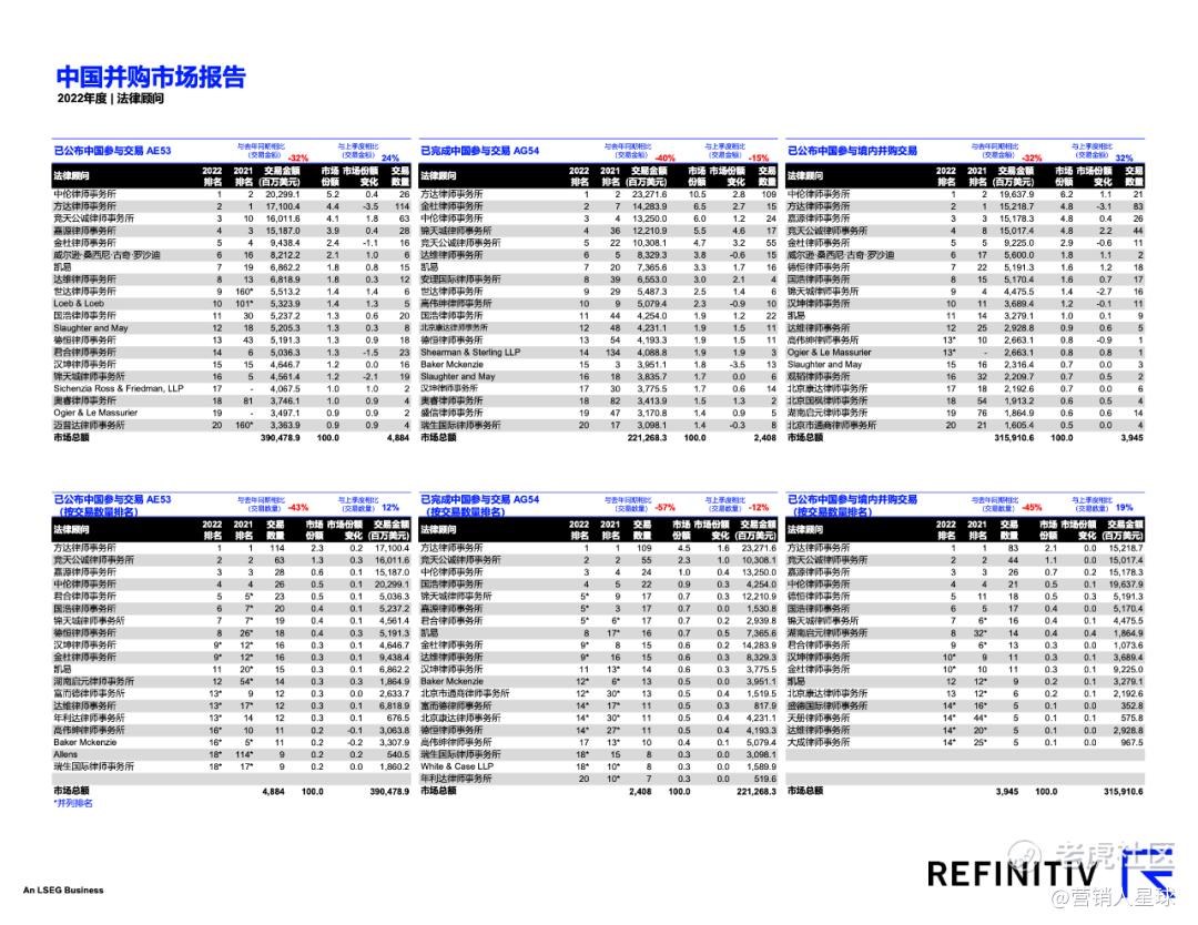 中伦 师事 所、方达 师事 所和竞天公诚 师事 所在2022年中国并购公告并购排行榜的相关 交易价值中排名前三。方达 师事 所、竞天公诚 师事 所和嘉源 师事 所在交易数量上位列 前三。