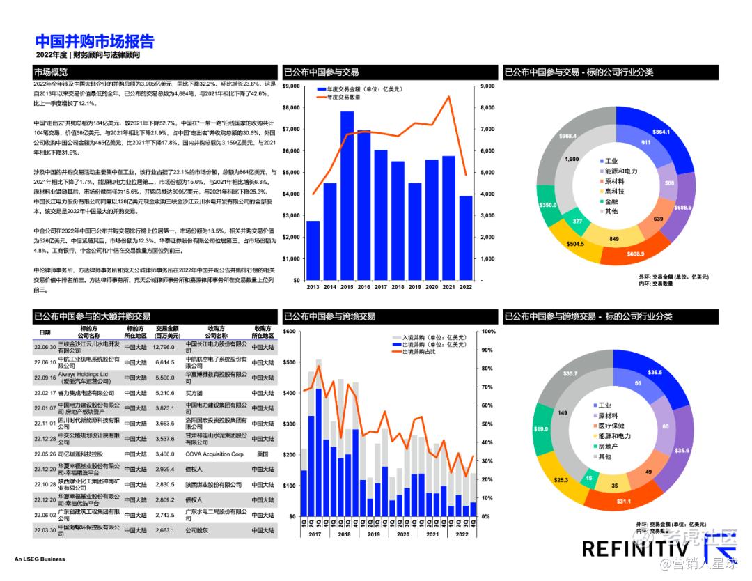 涉及中国的并购交易活动主要集中在工业,该行业占据了22.1%的市场份额,总额为864亿美元, 2021年相比下降了1.7%。能源和电力业位居第二,市场份额为15.6%, 2021年相比增长6.3%。原材料业紧随其后,市场份额同样为15.6%,并购总额达609亿美元, 2021年相比下降25.3%。中国长江电力股份有限公司同意以128亿美元现金收购三峡金沙江云川水电开发有限公司的全部股 本。该交易是2022年中国最大的并购交易。