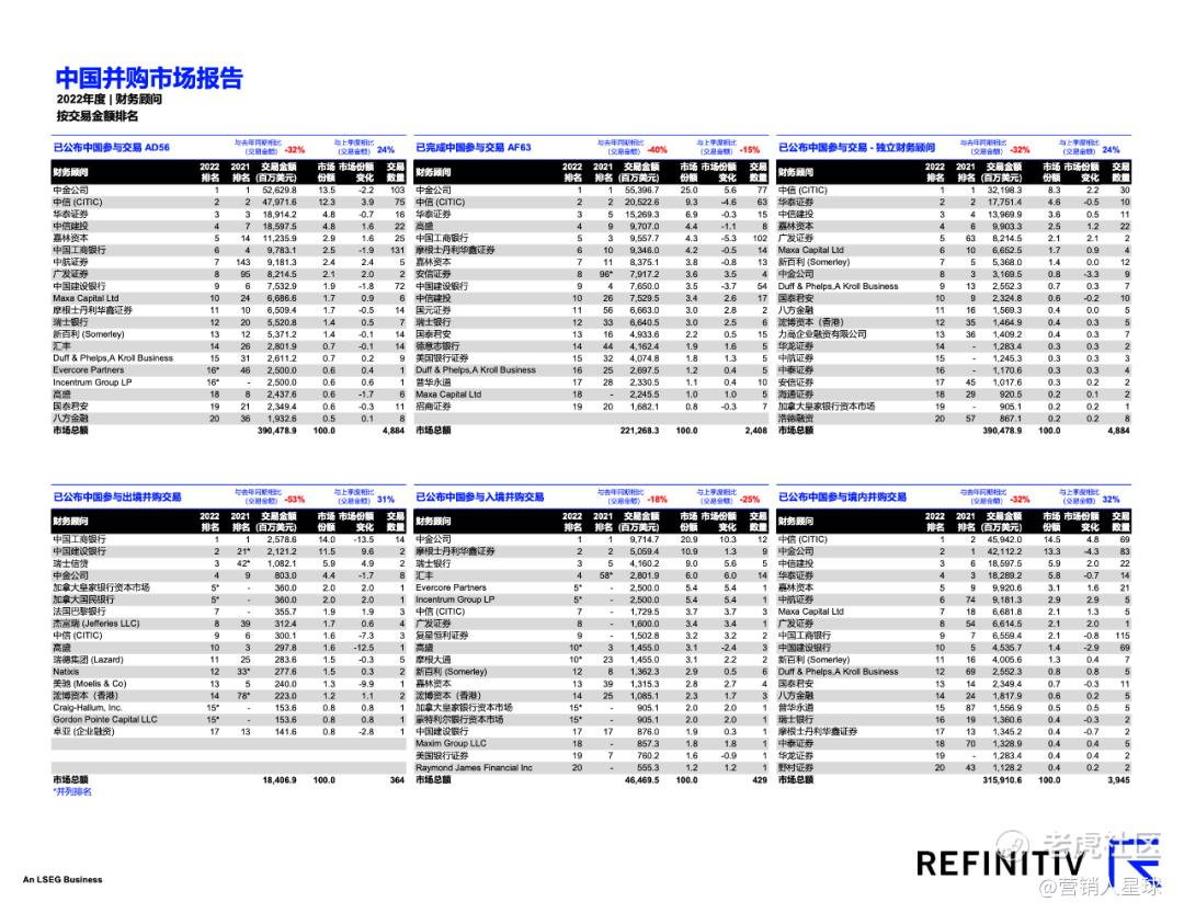 中金公司在2022年中国已公布并购交易排行榜上位居第一,市场份额为13.5%,相关并购交易价值 为526亿美元。中信紧随其后,市场份额为12.3%。华泰证券股份有限公司位居第三,占市场份额为 4.8%。工商银行、中金公司和中信在交易数量方面位列前三。