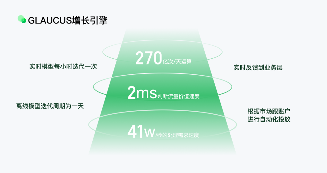 不仅如此,Glaucus引擎还具备超强的学习能力,Glaucus实时模型每小时自迭代一次,所有的用户行为实时反馈到业务层,离线模型的迭代周期控制在一天。另外,Glaucus引擎还有自动化投放管理能力,可以根据市场和账户的变化,对账户出价进行自动化微调,对账户计划进行自动扶持和关停。