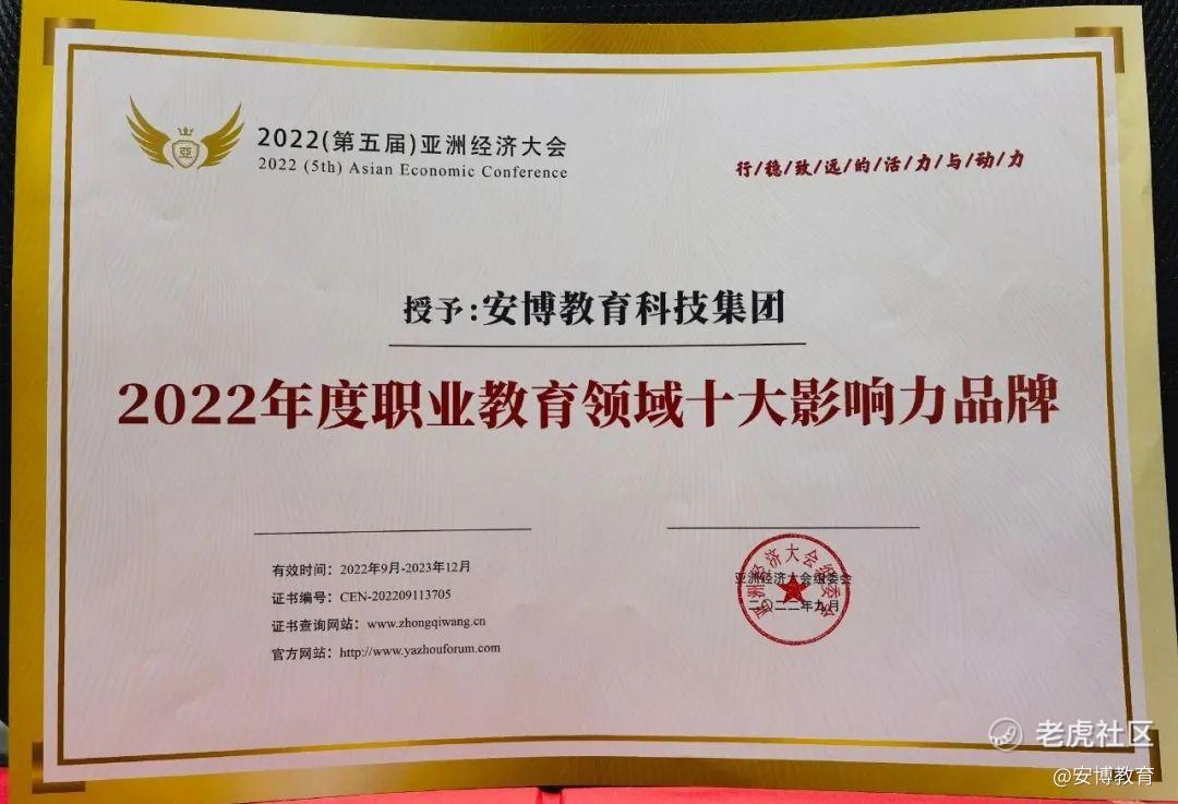 $安博教育(AMBO)$ 2023年1月5日,2022(第六届)博鳌企业论坛暨亚洲经济大会在海南成功举办。部委领导、专家学者、各行业优秀企业家代表共聚一堂,各界嘉宾围绕“再出发 向高质量发展迈进”的主题分享真知灼见,交流发展经验,探索可行路径,提振发展信心,为推动中国经济的高质量发展和中国式现代化贡献智慧与力量。在论坛颁奖典礼上,安博教育科技集团凭借多年来在职教领域的良好口碑和品牌综合实力,荣获“2022年度职业教育领域十大影响力品牌”。