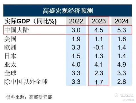 事实上,此前高盛集团对中国经济增速4.5%的预测,已属于国际较高水平。高盛当时预计,2023年除中国以外全球经济增速为1.7%,主要经济体的增速均将放缓,欧洲甚至大概率会进入衰退状态,而中国则将跑赢全球主要经济体,呈现加速增长趋势。