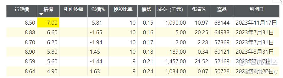 牛证成交活跃区位于收回价 8.5元。收回价8.5-8.99水平的牛证产品有9只,杠杆在4.9倍至7倍,68144及50174杠杆相对较高,杠杆分别有7倍及5.8倍。
