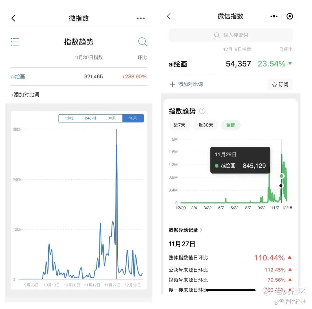 从百度指数、双微指数来看,AI绘画近日的关注度均大幅攀升。