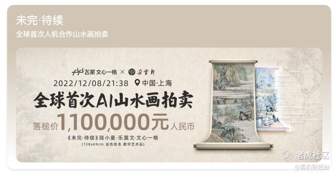 百度推出了AI艺术和创意辅助平台文心一格。在2022年7月举办的百度世界大会上,百度用AI复原了中国十大传世名画之一《富春山居图》的残卷。12月8日,百度联同海派画家乐震文补全的AI画作《未完·待续》,拍出了110万元人民币的高价。