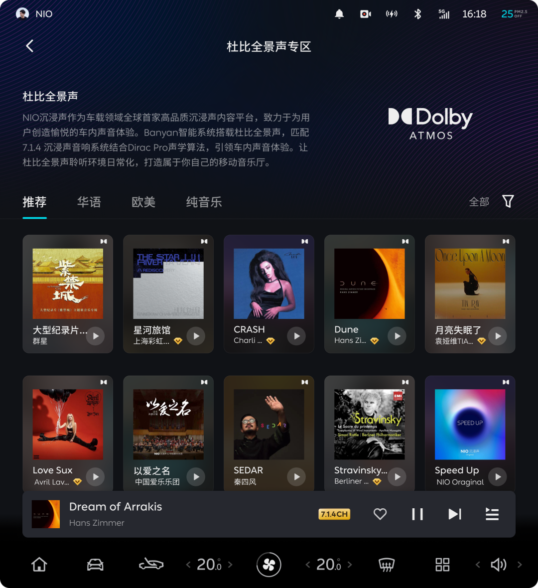 在“杜比全景声专区”中,NIO Radio音乐团队对NIO沉浸声内的杜比全景声音乐资源进行了聚合。此外,通过与腾讯音乐娱乐集团(TME)旗下QQ音乐的合作,我们将QQ音乐丰富的杜比全景声音乐曲库补充进了NIO沉浸声,涵盖欧美流行、华语流行、电影原声、电音、古典等热门音乐类型。