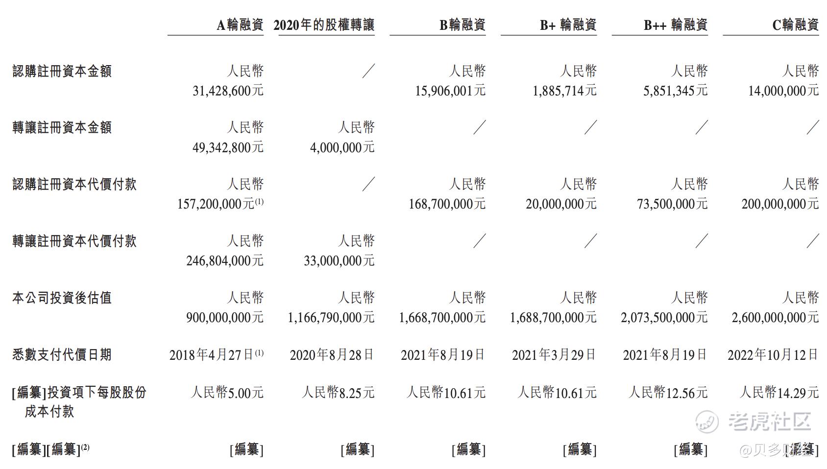 招股书显示,友芝友生物B轮和B+轮系列的每股成本均为人民币10.61元,投资后估值为16.887亿元;B++轮融资的每股成本为12.56元,投后估值为20.735亿元;C轮融资的每股成本则为14.29元,投后估值为26亿元。