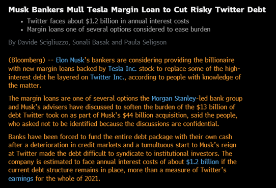 现在回到核心问题,为什么MS要主动帮客户提出减轻利息支出?而且从彭博的新闻来看,MS的态度比马斯克更积极,更想推动给贷款降利息的工作,特别是去置换那部分没有抵押的贷款($30亿)。(The discussions have so far focused on how to replace $3 billion of unsecured debt on which Twitter pays an interest rate of 11.75%)。
