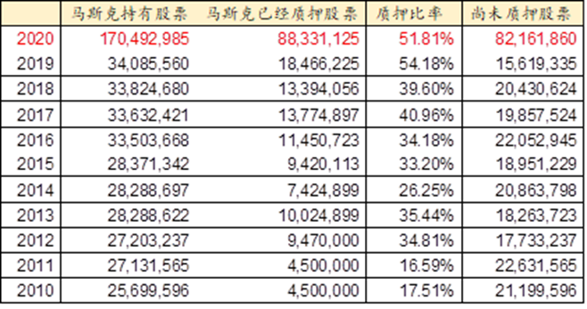 马斯克的特斯拉股票质押率非常高,下表是之前的统计。MS和他的关系最好,所以很有可能这些股票的绝大部分都在MS。根据当前股价来看(每股$170,2020年等同于每股$510),他2020年就质押了大约$450亿,考虑到之前的股价更高,实际套现金额说不定更高,这是个非常大的数字。