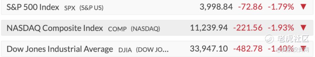 截至收盘,道指下跌482.78点,收于33,947.10点,跌幅1.4%。标普500指数下跌1.79%,收于3,998.84点。纳指下跌1.93%,收于11,239.94点。标普和纳指都创下自11月9日美国中期选举后的最大单日跌幅。